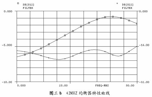 图二b是42MHz/6dB插片式固定均衡器电原理图,它采用了“T”型电路,调整L1、L2可使42MHz谐振点损耗低于0.6dB,均衡误差优于±0.4dB。